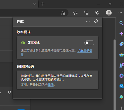 2.?之后,页面右上角会弹出【性能】窗口,我们可以在这里打开【效率模式】,也可以点击【了解更多信息】;