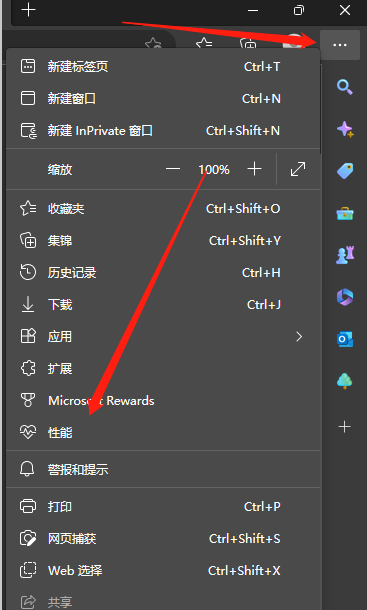 1.?我们打开Microsoft?Edge浏览器,在右上角找到并点击【...】的菜单按钮,在其中找到【性能】;