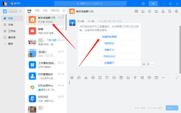 1.?首先,在钉钉电脑端中,我们点击主界面的【新手体验群】,找到并点击【创建特色群聊】;