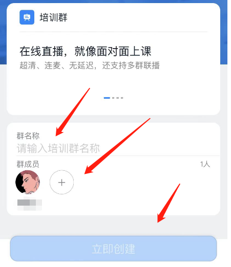 4.?我们这里拿【培训群】为例子,点击之后,跳转界面,输入培训群的群名称,邀请需要添加群的人员,点击【立即创建】即可。