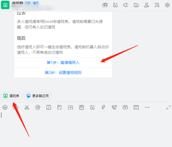 群内设置值班表,只需要确定值班时间和值班人,就可以一键生成值班表;点击值班表,可以清晰查看每日安排;机器人每日自动提醒值班人,不需要口头提醒,值班不遗忘。