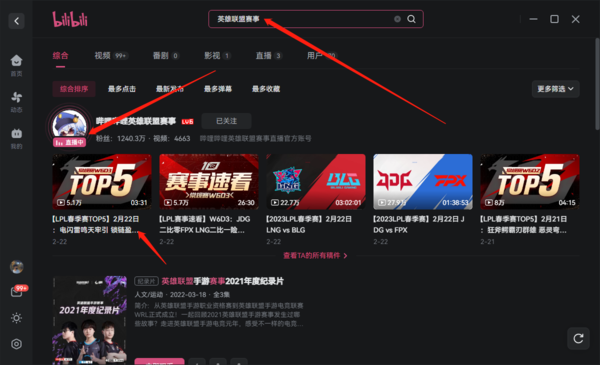 打开下载好的哔哩哔哩,搜索英雄联盟赛事,即可查看当前的直播、赛程、比分、积分榜等等,还有一些知名UP对游戏的复盘,哔哩哔哩中也有各大知名职业选手的公众号,大家可以与选手们进行互动,拉近距离。