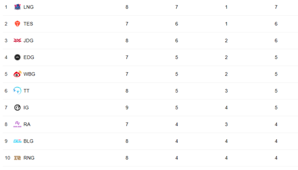 截止至2023年2月24日,目前的比分如图所示,前五名分别为LNG、TES、JDG、EDG、WBG,其中LNG目前以7分位居榜首,战队之前的比分差距都不大。