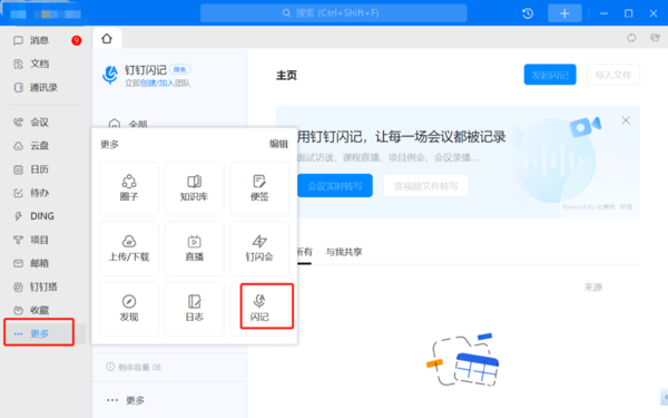 2、会议结束后我们打开软件界面的【更多】——【闪记】。