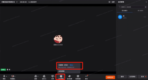 1、我们打开视频会议后,点击下方的【会议录制】——【云录制(闪记)】即可开始使用闪记录制本次视频会议。