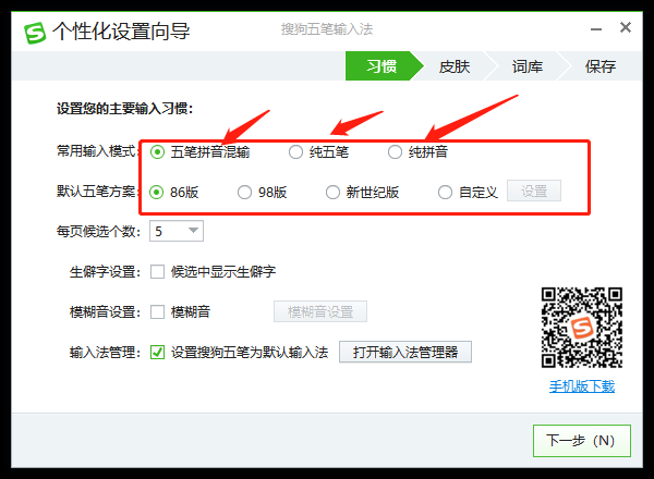 2.?之后,我们就可以设置【五笔+拼音混输识别】或【纯五笔】或【纯拼音】了。也可以选择【86版】、【98版】或【新世纪版】五笔方案。