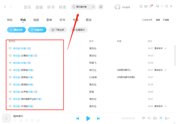 打开软件后,小编这里搜索大家熟知的【青花瓷伴奏】,即可看到搜索出各种各样的伴奏,如原曲伴奏、古筝版伴奏、钢琴伴奏、升调降调伴奏等,一定有大家想要的结果。