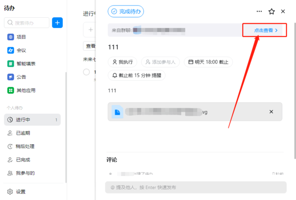 若我们需要寻找待办的具体定位,我们可以在待办中选择对应的待办,如图所示,点击上方的【点击查看】按钮,就会跳转至待办对应的生成位置。