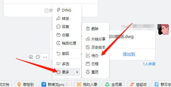 通常的我们在聊天窗口收到任务消息时,一般情况下我们很少会收到待办消息,所以需要我们主动添加至待办,小编测试后发现,文本、图片、文档文件、会议通知、项目通知、智能填表、群公告都可以设置成为待办,但是视频、表情包、群接龙等聊天程序等是无法添加待办的。
