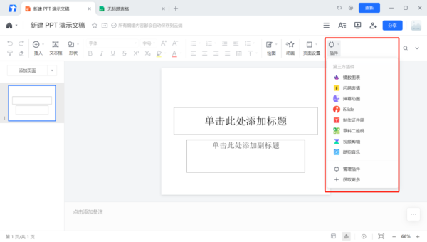 以PPT文档举例,如下图,点击插头按钮即可调用第三方插件。