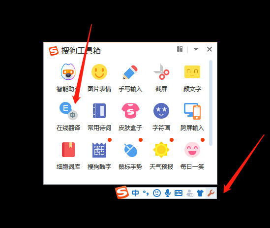 1、我们打开下载好的【搜狗拼音输入法】,切换出来后点击右侧的【工具箱】,找到【在线翻译】;