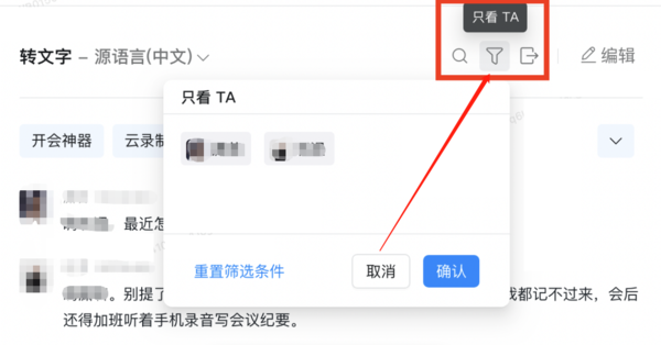 亮点三、搜索功能支持发言人的筛选,若只看某位人士的发言,可直接点击搜索框的右侧【只看TA】选项,选择后再进行搜索即可。