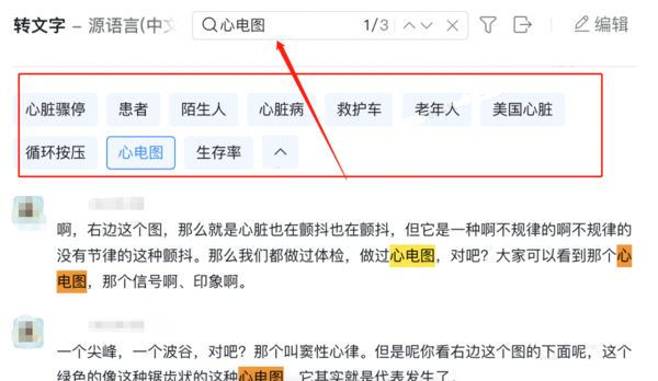 亮点二、智能关键词搜索,帮助我们快速提取想要的核心内容,快速定位。只需要在搜索框中输入或在智能生成的关键词中点击即可。