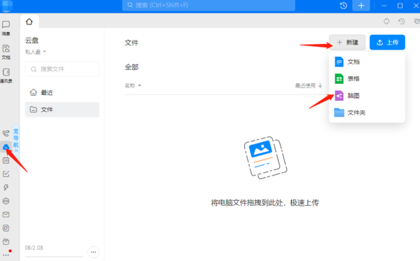 二、在【云盘】功能界面,,我们点击界面右上角的【+新建】按钮,在弹出的下拉框选项中选择【脑图】。