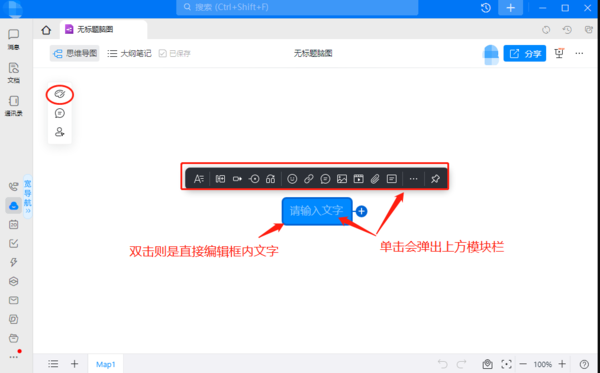 三、接着,我们绘制时,首先会看到主标题的编辑处,点击后,就可以弹出绘制工具了,我们可以利用工具对标题进行子节点、标注等的添加,双击主标题可对文本框进行内容编辑,且我们可以在左上方的【调色盘】图标上更改我们的脑图架构,可设置为【单向发散】【多向发散】等架构造型。