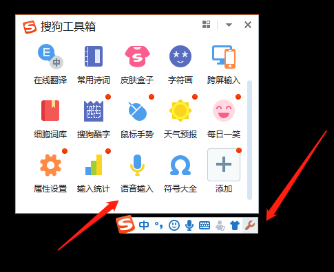 二、点击窗口右侧的【工具箱】按钮,在下拉菜单中找到【语音输入】功能并点击;