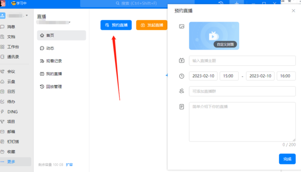 在首页中点击【预约直播】,填写对应的直播主题、预约时间、封面、直播群,时间到了之后会自动开启直播;