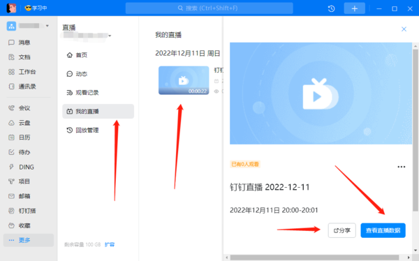 点击左侧【我的直播】,即可看到记录范围内我们发起过的直播,点击相应的直播,可以查看自己直播的回放,以及直播的观看数据,也可以分享直播。