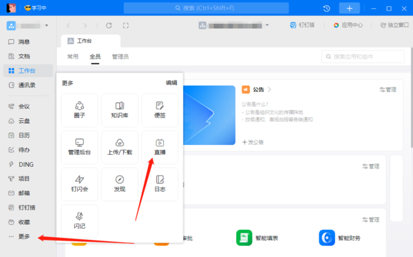 一、打开并登陆我们的钉钉PC版,在主界面左侧选择【更多】,找到其中的【直播】;
