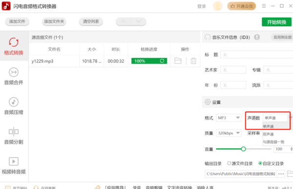 将双声道转换为单声道的方法与单声道转换为双声道的方法一致,在【声道数】参数内,将选项变为【单声道】。