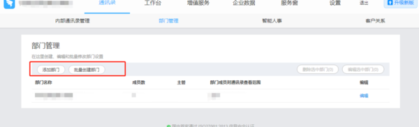 登陆【管理后台】,点击【部门管理】,即可【添加部门】或【批量创建部门】。
