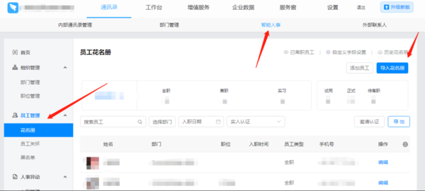 在【管理后台】中,点击【智能人事】,点击左侧【员工管理】的花名册,可查看人员当前的状态以及【已离职员工】等等。