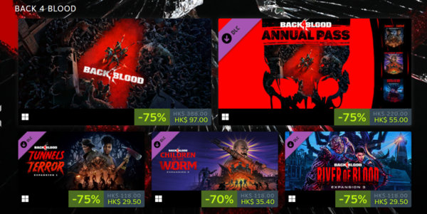 ◆BACK?4?BLOOD,游戏本体享受2.5折优惠,游戏DLC最高享受2.5折优惠。