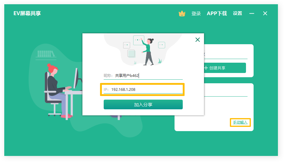 若未自动查找到屏幕共享设备,可以通过手动输入【共享端IP地址】加入分享