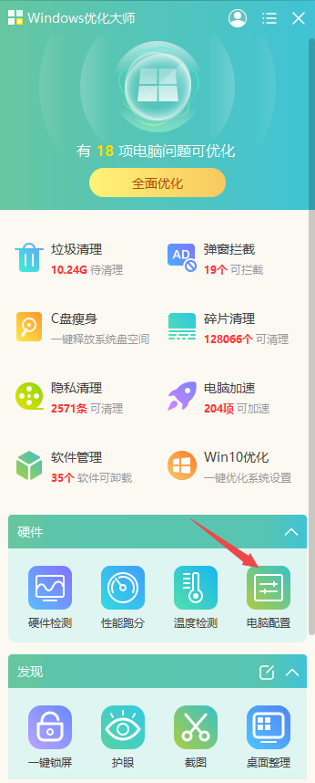 ①启动电脑端的windows优化大师,然后点击【硬件】功能中的随便一个功能,比如【电脑配置】选项。