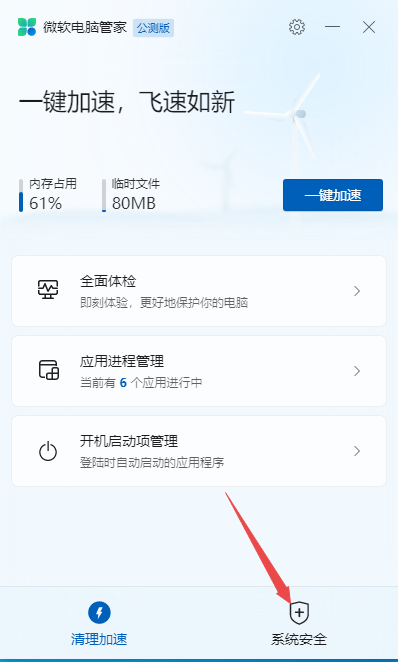 第一步,启动电脑上的微软电脑管家,然后点击界面右下角的【系统安全】选项。