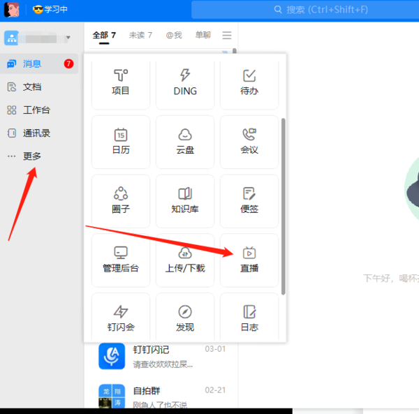 1、打开钉钉电脑版,在左侧或者【更多】选项中点击【直播】;