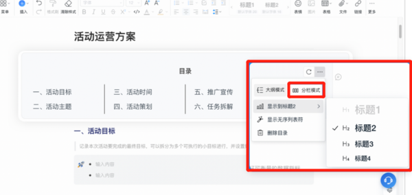 文档插入目录之后,可以选择限时到某一级标题,统一格式,这样目录分栏模式更加美观。
