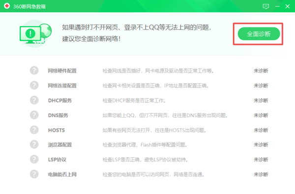 2.接着就会弹出360断网急救箱的界面了,点击【全面诊断】按钮,软件就会开始对电脑的网络进行修复了。