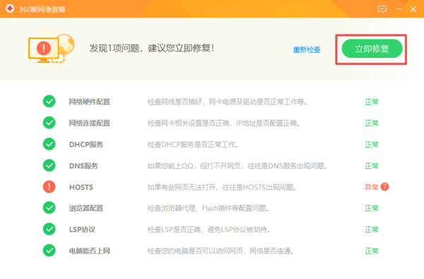 3.如果软件诊断出问题的话,点击【立即修复】按钮,就可以对电脑网络出现的问题进行修复了。