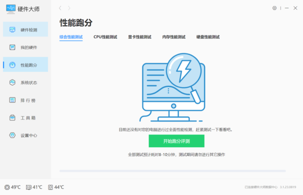 通过排序、压缩、解压缩、加密、解密等不同项目的测式,?可以评估CPU处理器的综合性能和单核性能。显卡测试基于3DMark官方授权的最新模块Night?Raid,是目前最权威,最公平的显卡性能测试项目,可精准考察游戏性能高低。可一键综合检测爱机电脑分数,在排行榜上与其它机型一较高低。