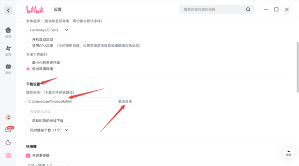 2.接着就进入到哔哩哔哩的设置界面了,在此界面中,我们找到【下载设置】一栏选择下的【缓存目录】选项,这个就是哔哩哔哩下载视频保存的位置了。我们找到电脑系统的这个路径,就可以看到自己下载保存的视频了。