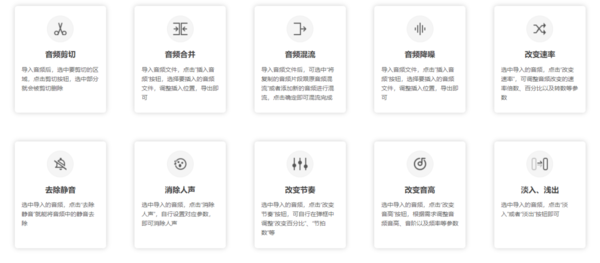 支持音频剪切、合并、复制、粘贴等功能,还支持音频降噪、音频混流、改变速率、消除人声等功能,高效便捷,全方位帮您解决音频剪辑问题!