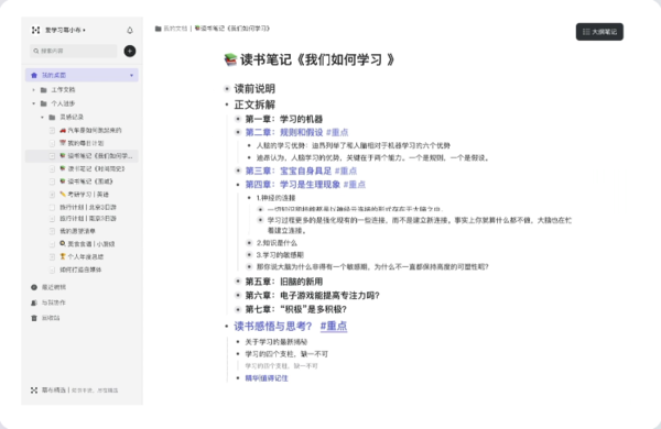 幕布笔记还支持灵活折叠,不想关注的内容,可以随意的进行折叠,当然了,也可以打开详细的内容进行浏览。当然了,印象笔记与幕布笔记还有其他的区别,这也需要大家多多去使用,多多去发现。