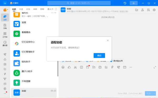 首先,确保远程协助双方都是钉钉在线的状态,因为有一方是不在线的状态,我们都是无法使用远程协助功能的。