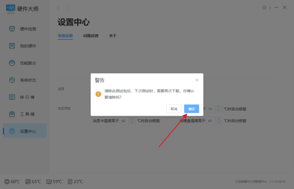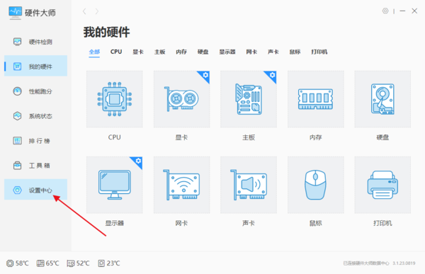 ②然后,点击硬件大师窗口左侧列表中的【设置中心】选项。