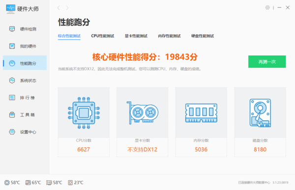 ⑤最后,当我们再次点击硬件大师左侧的【性能跑分】选项中,我们就看不到之前的跑分结果了。