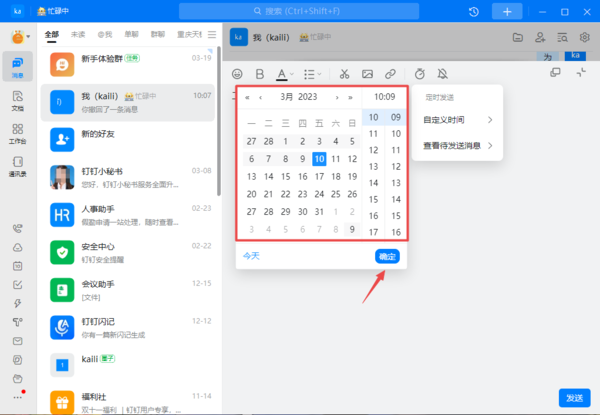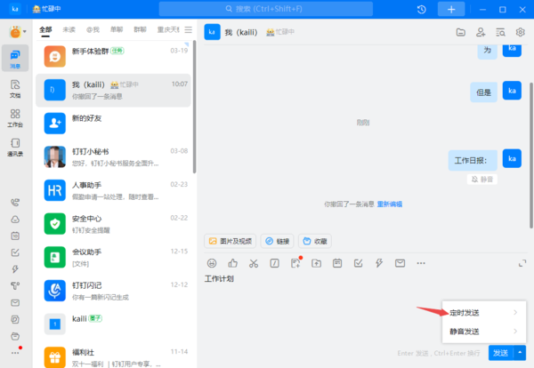 介绍完了钉钉给别人发送静音消息的方法后,钉钉最新版还新增了一个定时发送消息的功能,那么此功能又该如何实现呢,继续往下看吧。