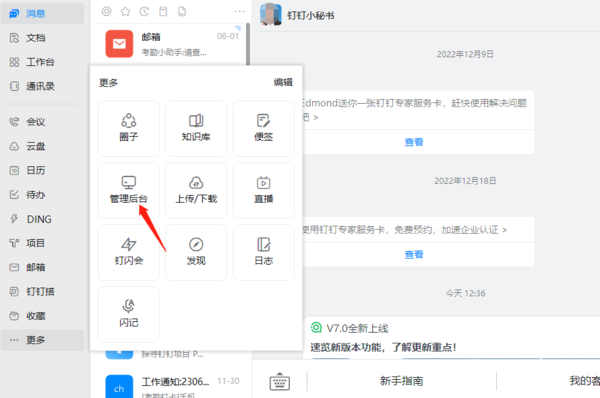我们打开钉钉,来到主界面,点击左侧模块栏【更多】,在这里可以看到【管理后台】按钮,点击后即可跳转网页,进入钉钉【企业管理后台】网页。