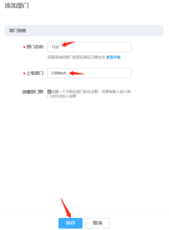 在这里,我们可以输入部门名称,以及所指向的上级部门,如果我们要添加1级部门,那直接指向企业即可;如果要添加2级部门,那就需要指向1级部门,这里还需大家自行甄别,最后点击【保存】以完成添加。