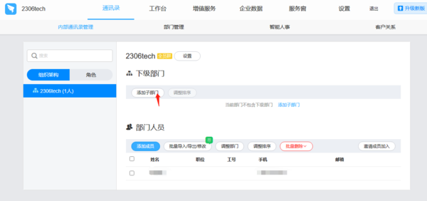 然后,我们在通讯录管理页面中,可以看到企业的部门架构,以及边上的按钮【添加子部门】,点击即可进入钉钉添加子部门页面;