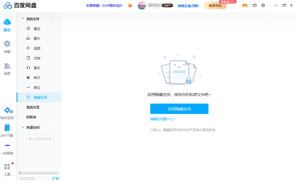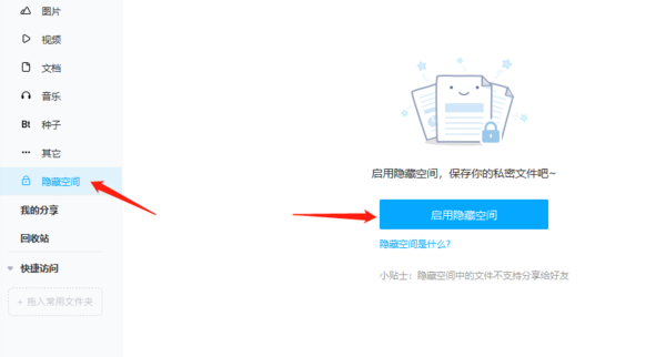 1、首先,我们进入百度网盘,在左侧文件列表中找到【隐藏空间】;