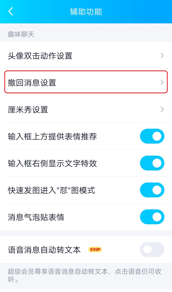 4.进入到软件的辅助功能设置界面当中后,找到【撤回消息设置】选项,并点击进入。