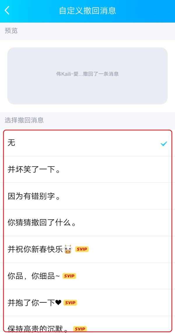 在QQ的自定义撤回消息界面当中,此时在界面的下方,我们可以根据自己的实际需求来选择撤回消息的内容,比如【并坏笑了一下】、【因为有错别字】、【你猜猜撤回了什么】等,设置好后,界面顶部会弹出【设置成功】的字样。