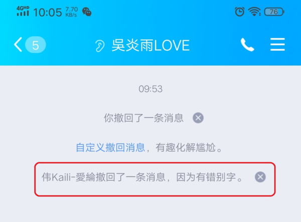最后我们回到与好友的聊天界面当中,当遇到有需要撤回的消息时,选择消息撤回,然后我们就可以看到自定义的撤回消息的内容了,好玩更有意思。