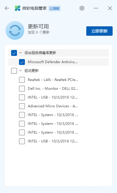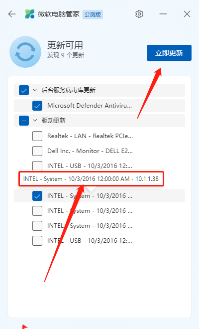 3、鼠标悬停在每个驱动选项中,可以查看驱动全程,大家可以查询是否需要,之后勾选需要更新的驱动,点击【立即更新】等待即可;